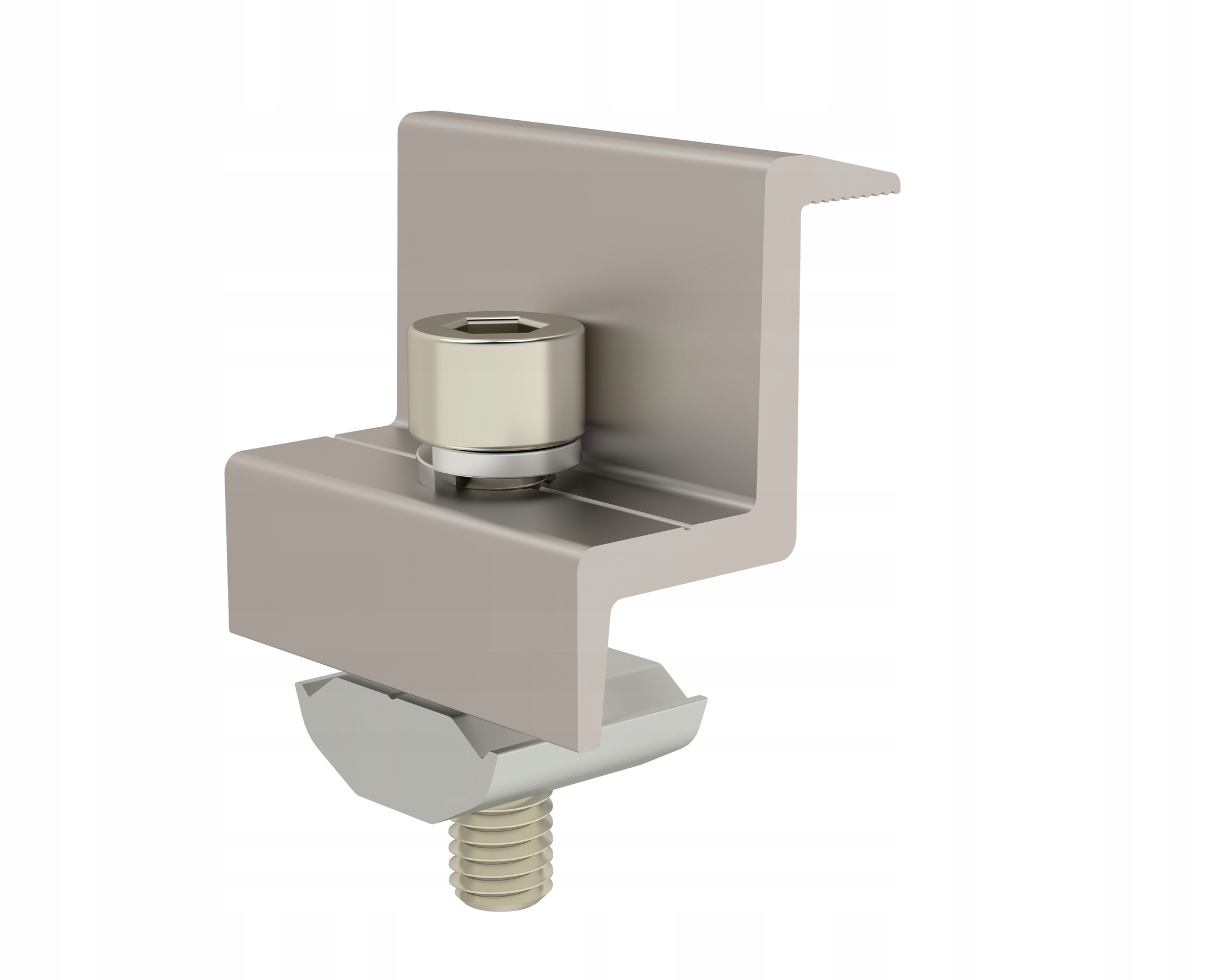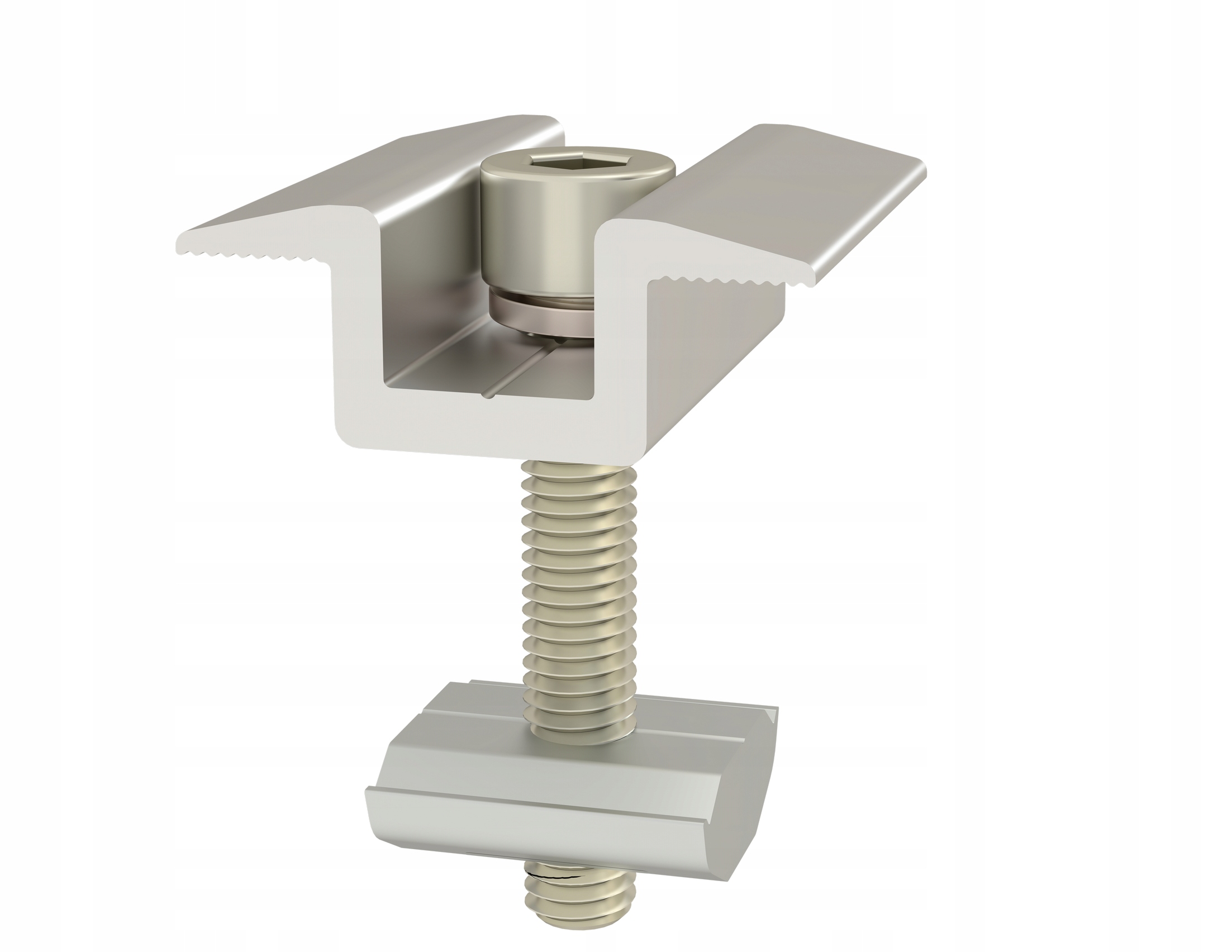 - Заземляющий зажим и шайбы позволяют надежно заземлить отдельные панели к заземляющему проводнику установки. Анодированные панели и монтажные рейки имеют покрытие с изоляционными свойствами, поэтому необходимо использовать шайбы, прокалывающие изоляцию, обеспечивающие надежное металлическое соединение отдельных панелей с монтажной рейкой, а затем с заземляющим проводом.