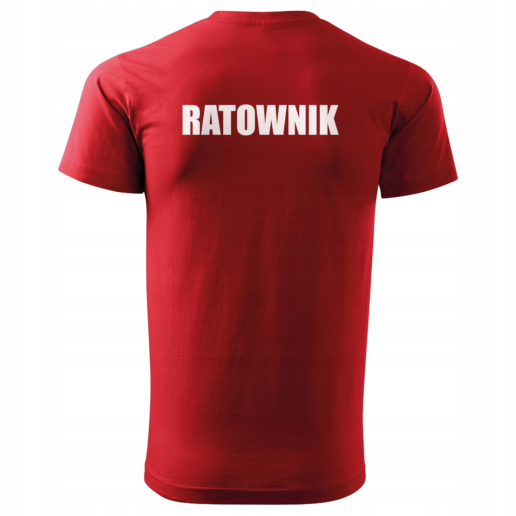Красная хлопковая футболка для спасателя WOPR с надписью «RATOWNIK» на груди и спине. Идеально подходит для спасателей, работающих в бассейнах или водоемах.