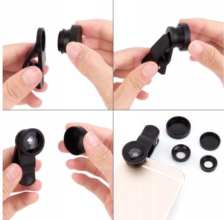 В комплект входит универсальная клипса, позволяющая прикрепить объектив к устройству, крышки объектива для защиты от царапин и чехол.