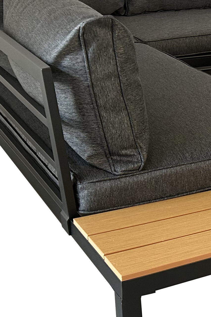 Он идеально смотрится на террасе и на лужайке. Стол со столешницей из полидерева. В комплект входят 3 подушки сиденья и 6 подушек спинки. Материал подушки дополнительно пропитан, поэтому капли не впитывают влагу. Материал съемный для стирки. Подушки очень удобные (не обычный полиэстер)