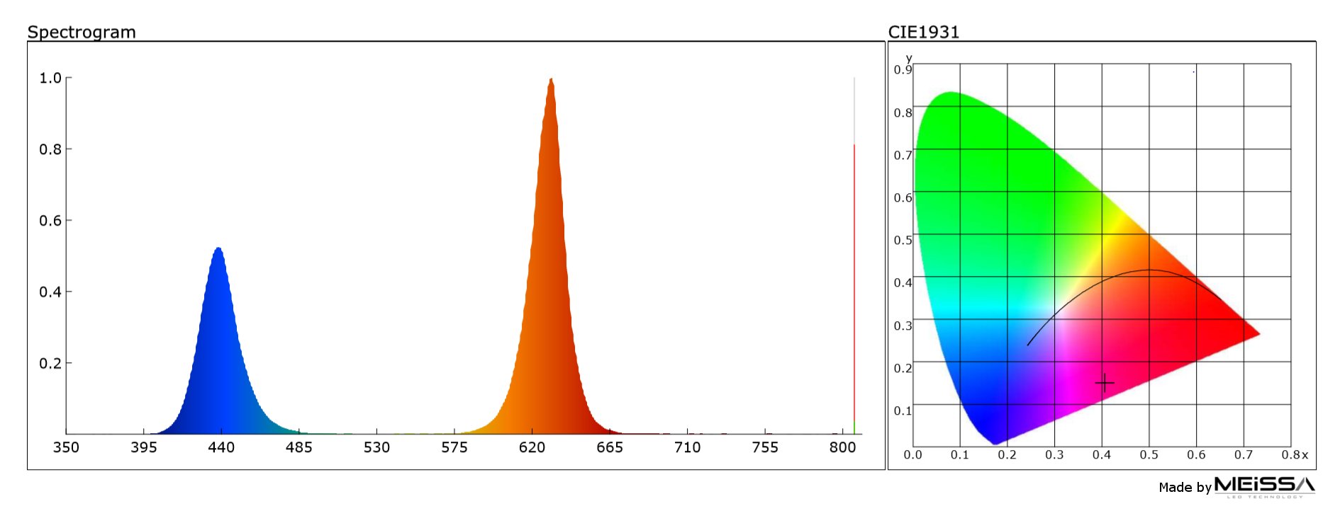 Он был измерен компанией MEISSA. Он показывает, что реальный спектр ленты LED 5050 300D GROW был измерен с помощью профессионального оборудования. Я показываю, что длины волн синего света составляют от 390 до 460 нм с пиком при 440 нм, а красного света от 580 до 660 нм с пиком 440 нм. самое высокое значение при 630 нм. Это идеально соответствует значениям, при которых растения поглощают максимальное количество хлорофилла.
