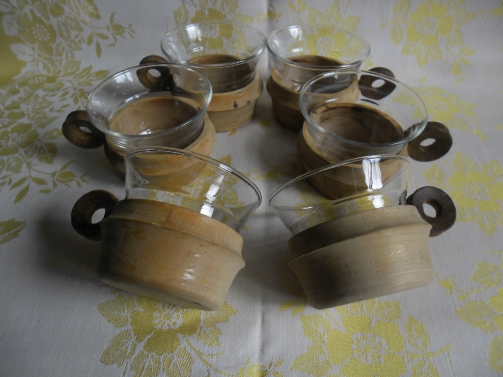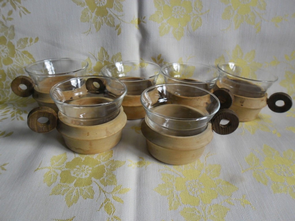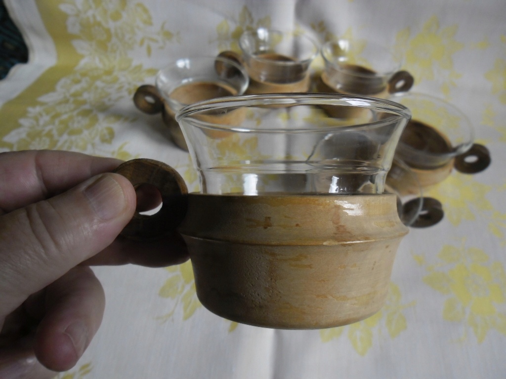 НАБОР СТАКАНОВ С ДЕРЕВЯННЫМИ РУЧКАМИ И КОРЗИНАМИ ДИЗАЙН 1960-Х ГОДОВ.СОСТОЯНИЕ ХОРОШЕЕ.ДЕТАЛИ ВИДНЫ НА ФОТО.