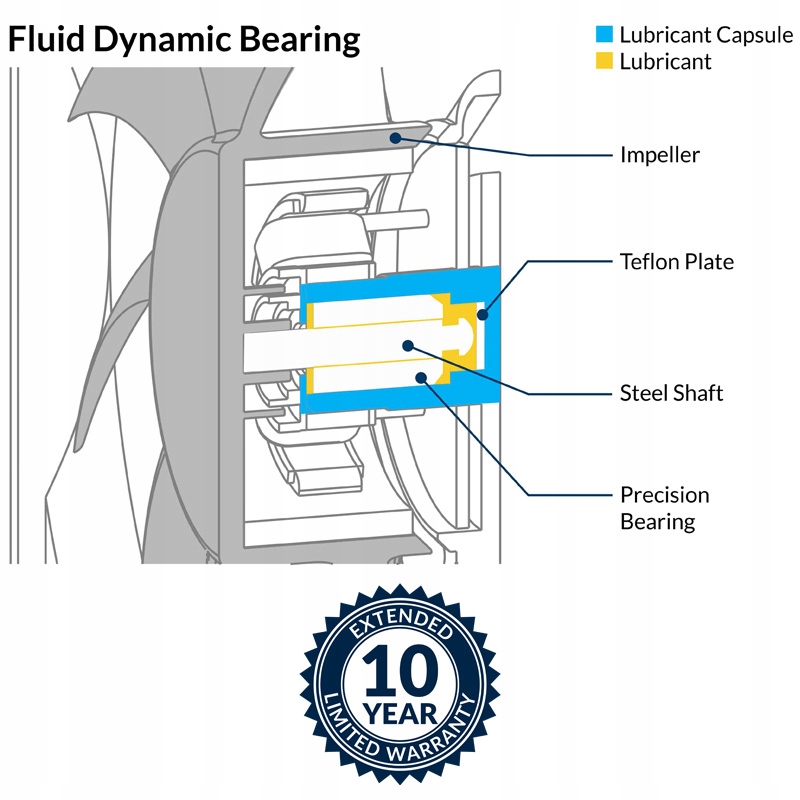 Подшипник Fluid Dynamic оснащен масляной капсулой, предотвращающей утечку смазки. Это делает подшипник таким же тихим, как и подшипник скольжения, но имеет гораздо более длительный срок службы.