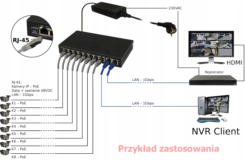 Технология PoE обеспечивает сетевое подключение и снижает затраты на установку за счет устранения необходимости прокладывать отдельный кабель питания для каждого устройства. Помимо камер, таким образом можно питать сетевые устройства, использующие эту технологию, например IP-телефон, точку доступа, маршрутизатор.