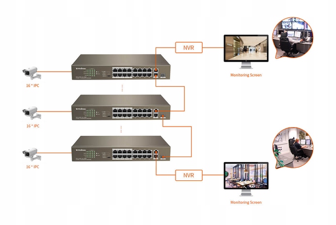 При наличии около 100 терминалов в сети каскадирование 6 устройств через G1, G2/SFP2 может обеспечить до 96 каналы мониторинга. Он поддерживает мощность 300/500 Вт и обеспечивает стабильную передачу видео без перерывов. Если оба конца устройств подключены к NVR, видео можно смотреть локально.