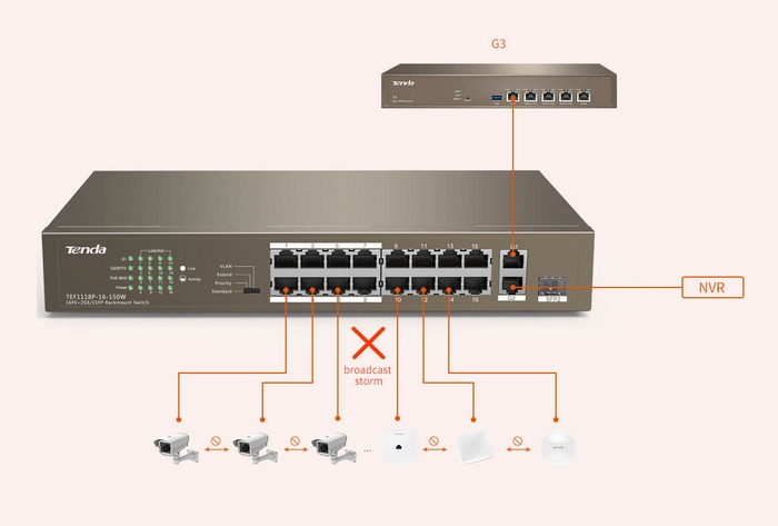 В этом режиме порты с 1 по 8 имеют более высокий приоритет, чем другие, и все порты могут взаимодействовать друг с другом. Когда коммутатор подключен к нескольким IP-камерам, рекомендуется использовать этот режим для повышения плавности передачи данных, когда основные IP-камеры подключены к портам с более высоким приоритетом, и подключить 2 порта восходящей связи (порты G1 и G2/SFP2) к устройствам восходящей связи (например, NVR). или маршрутизатор).