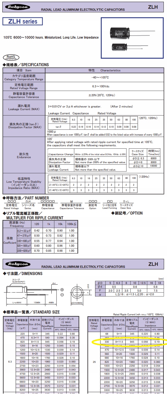 конденсатор 330uF25V RUBYCON 8x12.5mm LoEsr серії ZLH