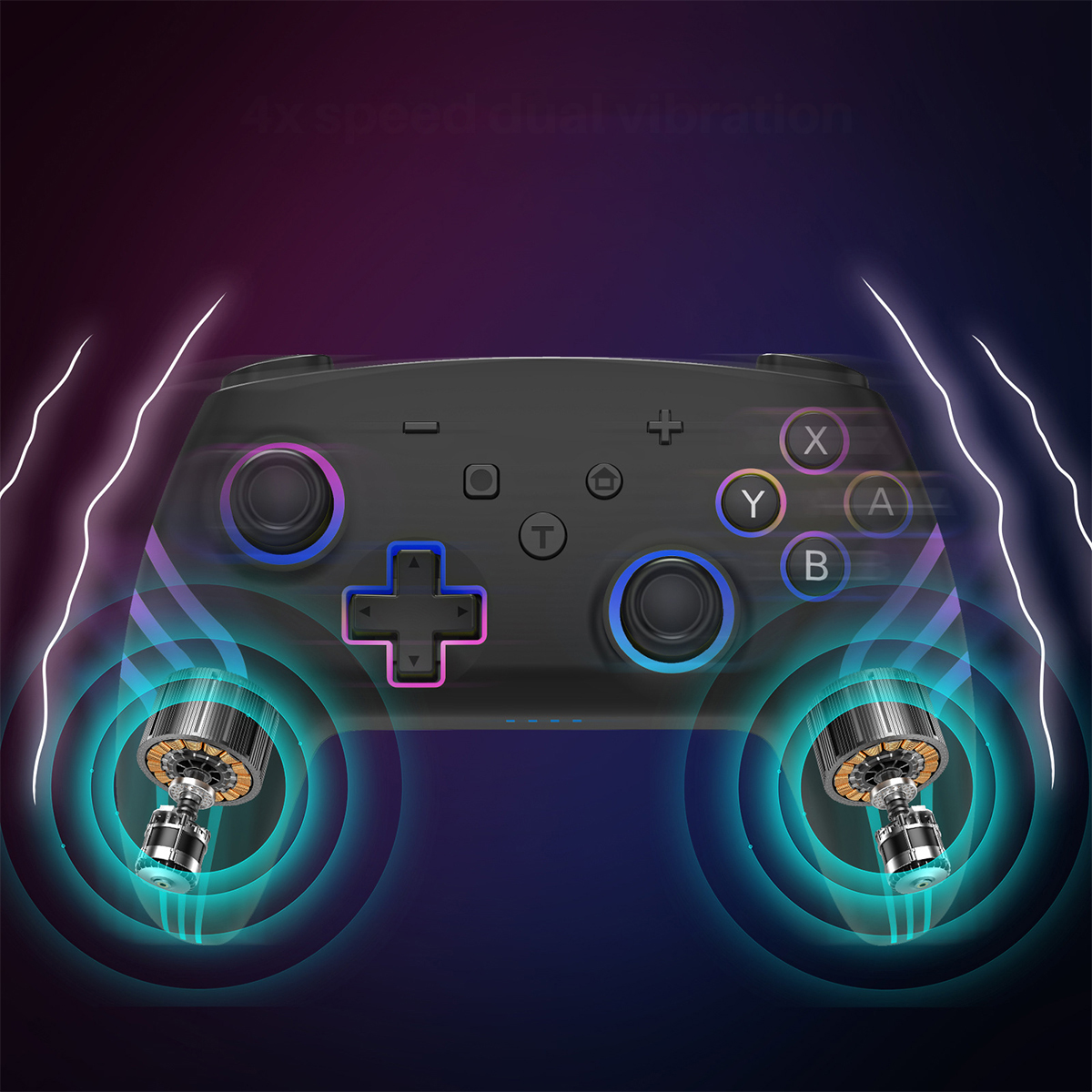 Контроллер Switch Pro оснащен двумя вибрарующими двигателями с тремя точными уровнями вибрации: нет, низко и высокий, что обеспечивает превосходную обратную связь и значительно улучшает опыт игры. Контроллер предлагает два режима: автоматическое турбо и ручное турбо и три регулируемых турбо-скорости (5-10-15 Гц), что делает его идеальным для игр FPS.