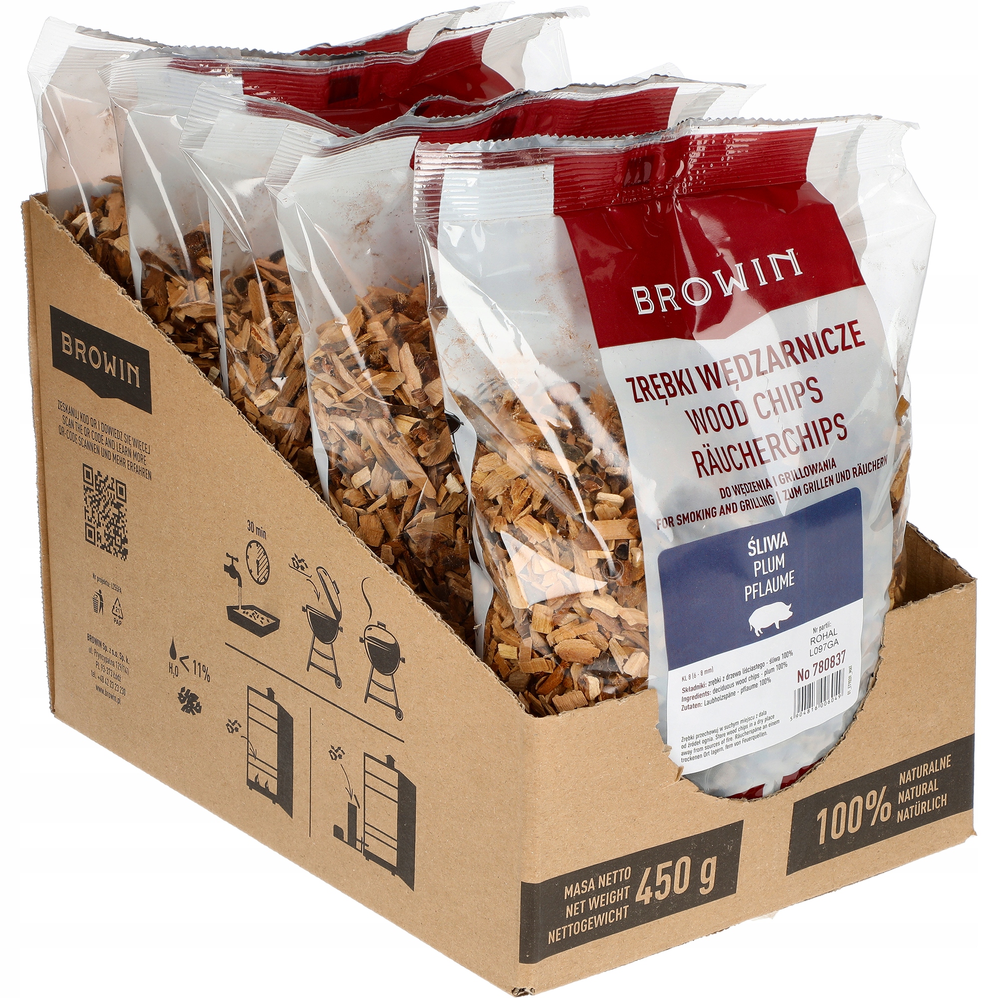 Количества щепы в упаковке (450 г) хватит на несколько часов копчения (в зависимости от используемого оборудования) – не беспокоясь о том, что она закончится при приготовлении любимых блюд.