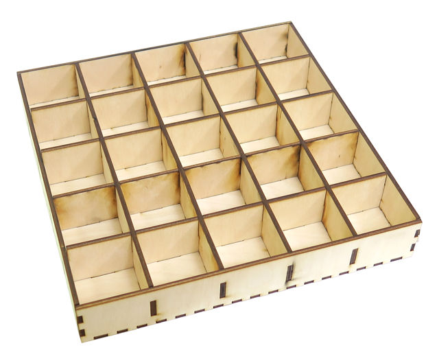 Ящик из фанеры толщиной 3 мм с 25 отделениями с внешней размеры: 21,8x21,8x3,5см.