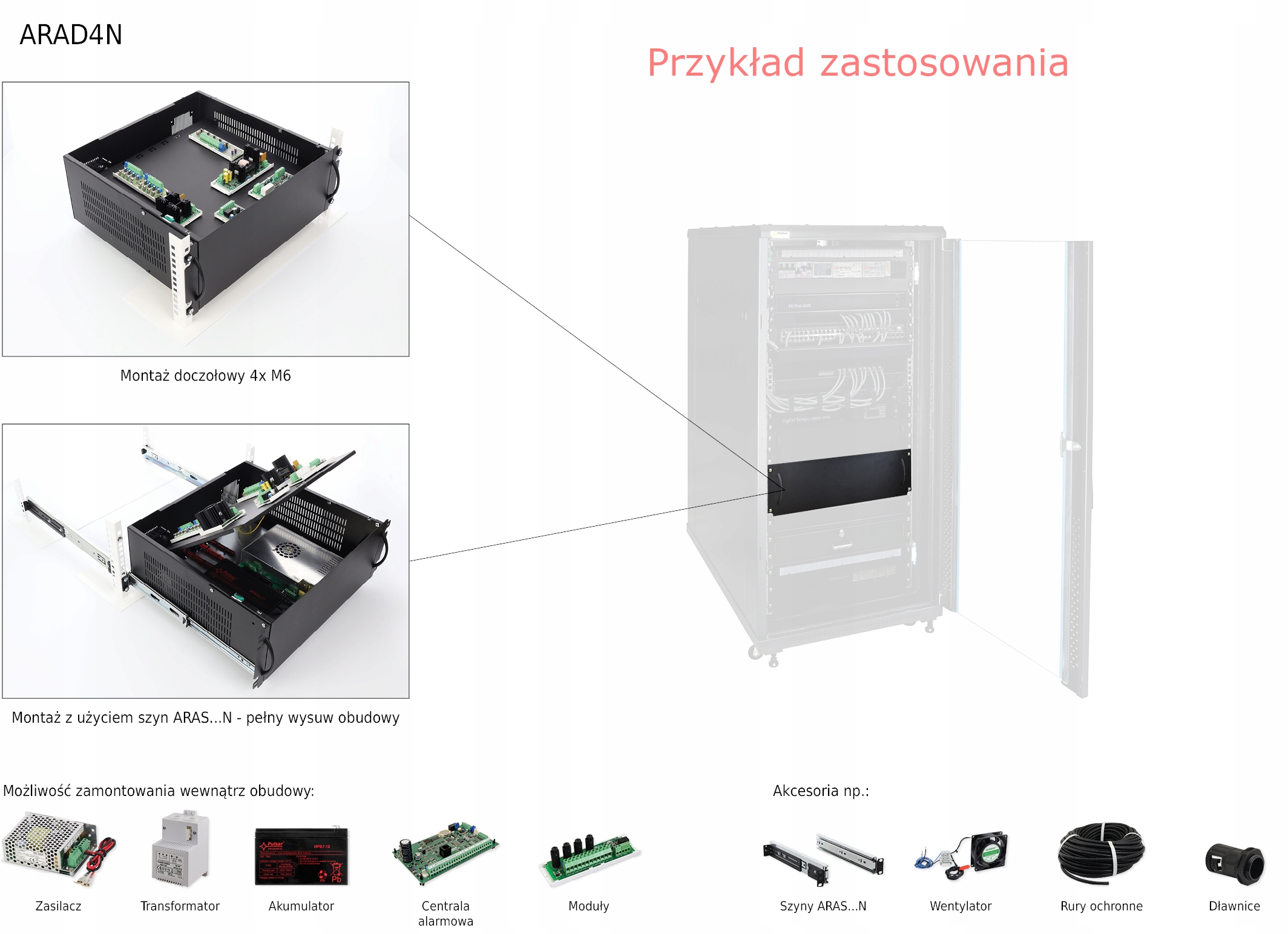 Из-за своей конструкции корпус ARAD4N предназначен для установки в шкафах на стойках, 600-1000 мм, стандартный 19 дюймов.