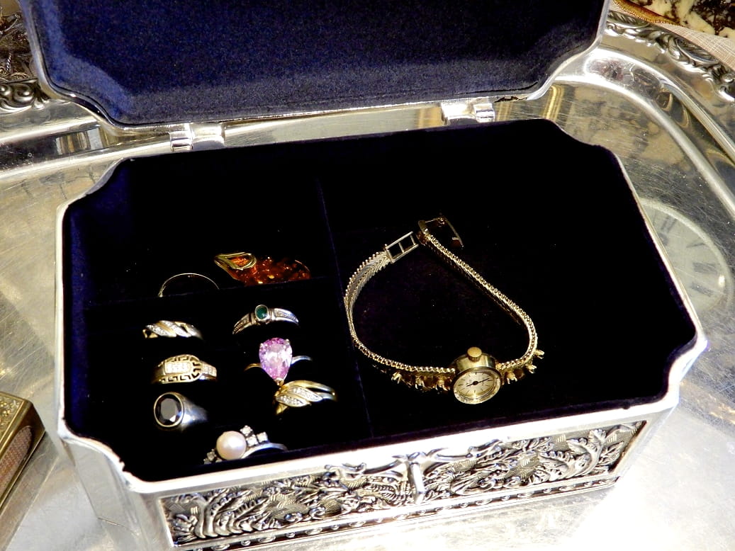 .Цветочные, плотные орнаменты прекрасно смотрятся на контрасте с красивыми, зеркальными поверхностями на крышке и боковых сторонах шкатулки.Очень добротно сделана, тяжелая. для своего размера. Внутри подкладка из материала, напоминающего темно-синий бархат. Внутреннее пространство разделено: половина для колец и, возможно, цепей, а половина для других сокровищ.