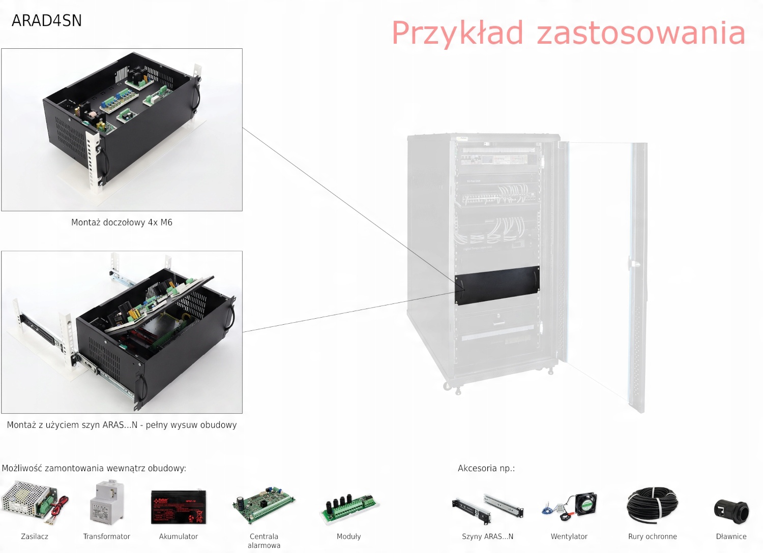 Благодаря своей конструкции корпус ARAD4SN предназначен для установки в шкафы RACK глубиной 450 мм, стандарт 19 дюймов.