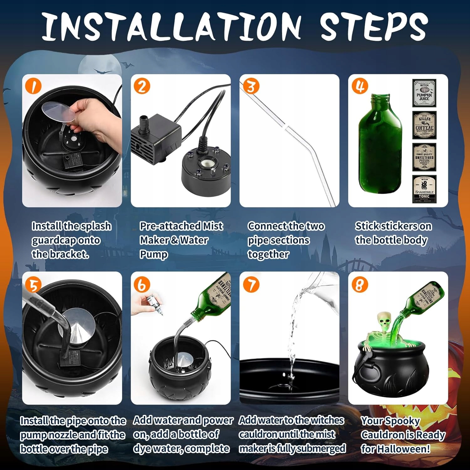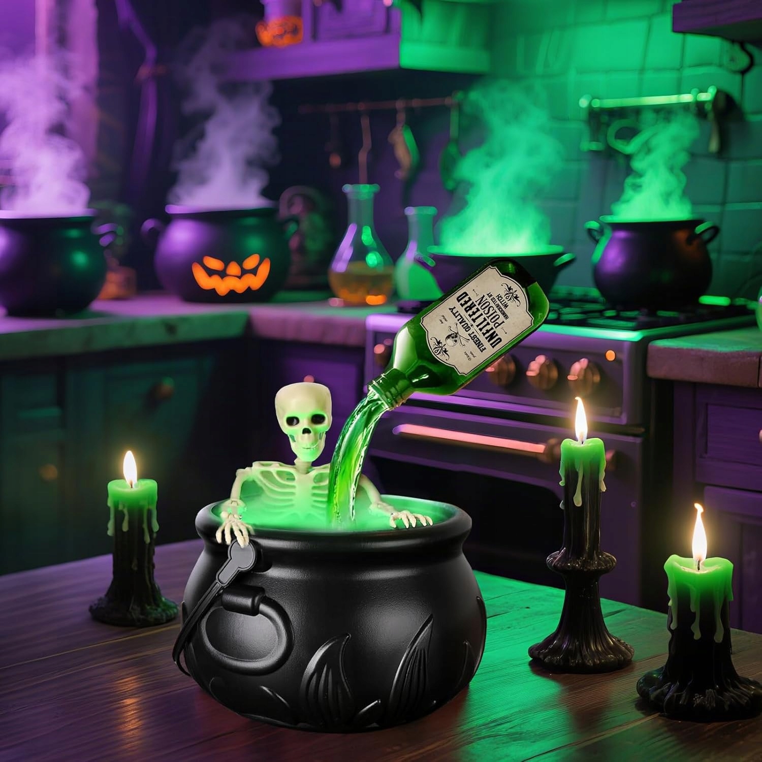 Декоративный набор для Хэллоуина содержит котел, бутылки зелье, генератор тумана, скелет и наклейки, которые вместе создают необычный эффект. Сборка занимает всего несколько минут, и все готово к использованию немедленно. 🔮