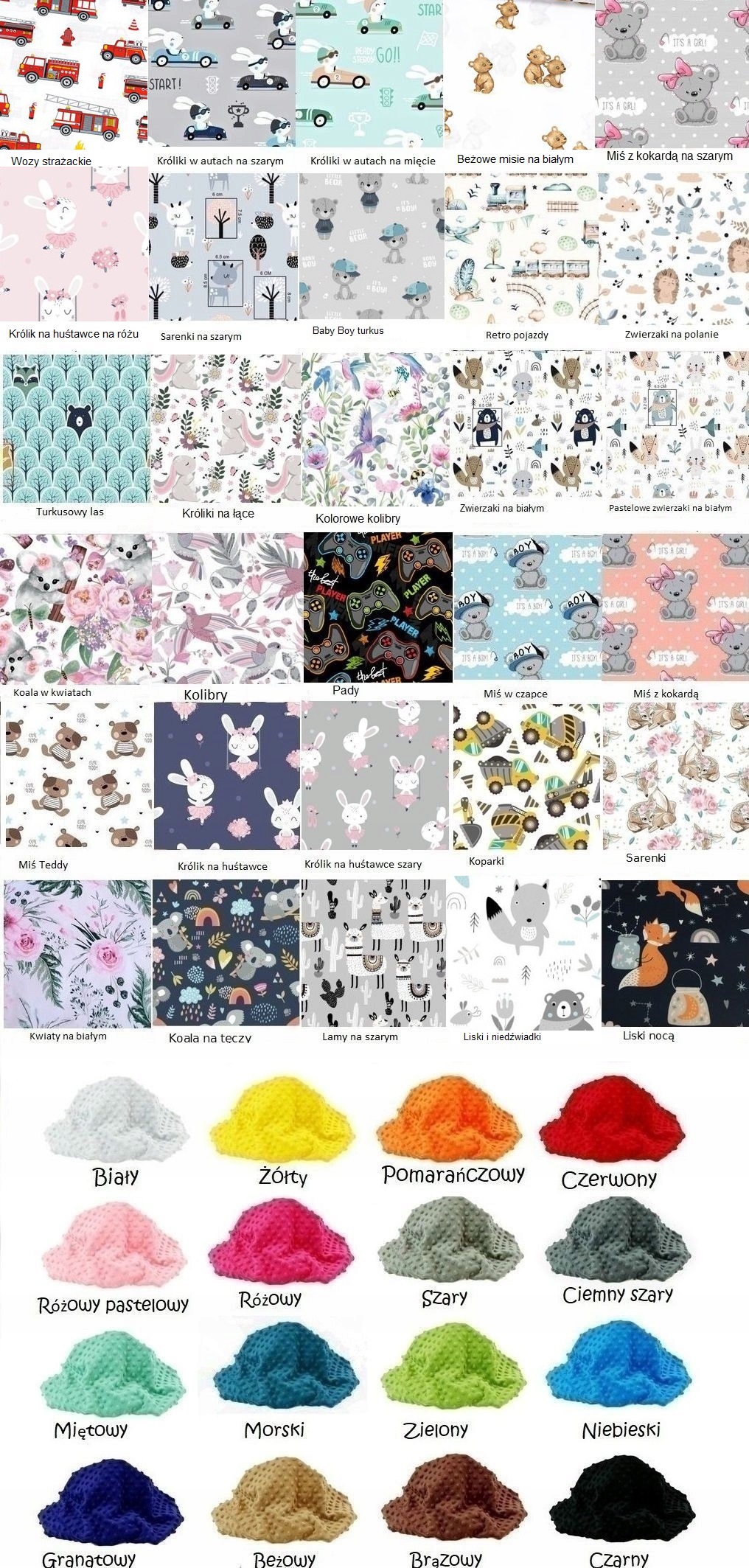 Мы предлагаем красивые одеяла для тележки или кроватки. (100% хлопок) материалы, которые они имеют все необходимые сертификаты, позволяющие им связываться с детьми, включая Oko-Tex Standard 100. Выбрать 3 версии толщины одеяла (одеяло из оптимальной версии отправляется по умолчанию)