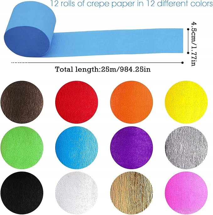 - 12 рулонов 25 м, цветной креповой бумаги: высококачественная креповая бумага, без запаха и экологически чистая, она не является водонепроницаемой. 12 цветов: желтый, коричневый, оранжевый, красный, розовый, фиолетовый, голубой, зеленый, золотой, серебро, белый и черный.