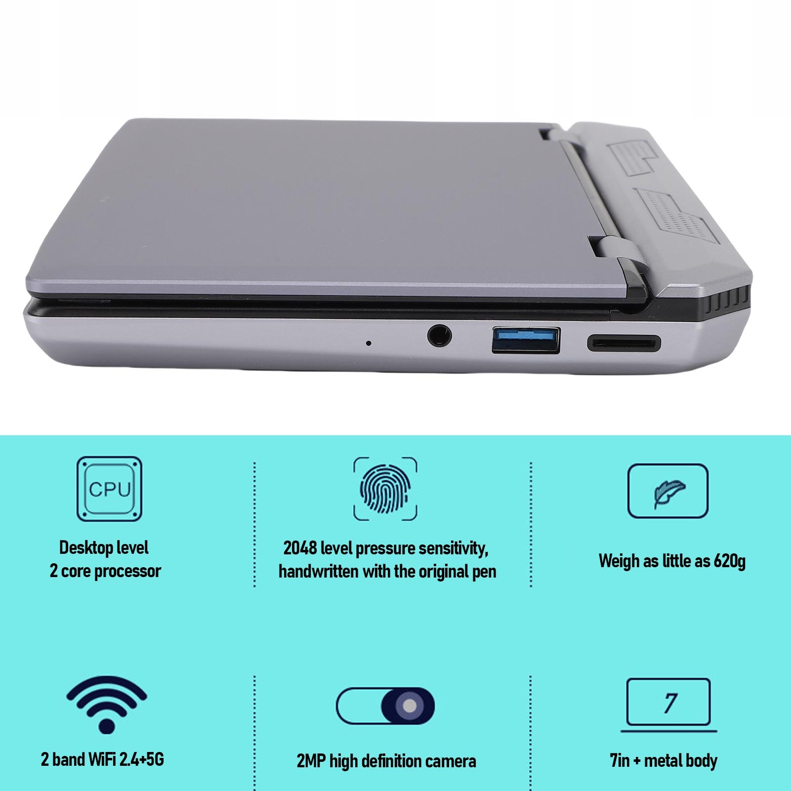 4. Высокое определение и длительное время: этот 7 -дюймовый ручный ноутбук имеет целый металлический корпус, что не только долгое время, но также имеет изысканный внешний вид, обеспечивая высокий опыт пользователя. Оснащено сенсорным экраном, технологией обработки с ЧПУ и руководством пользователя для оригинальной ручки, которую легко перемещать и щелкнуть, что делает операцию более удобной. Оснащен встроенной камерой высокого разрешения 2MP, которая поддерживает видео подключения и батарею с высокой плотностью с высокой плотностью 3000 мАч
