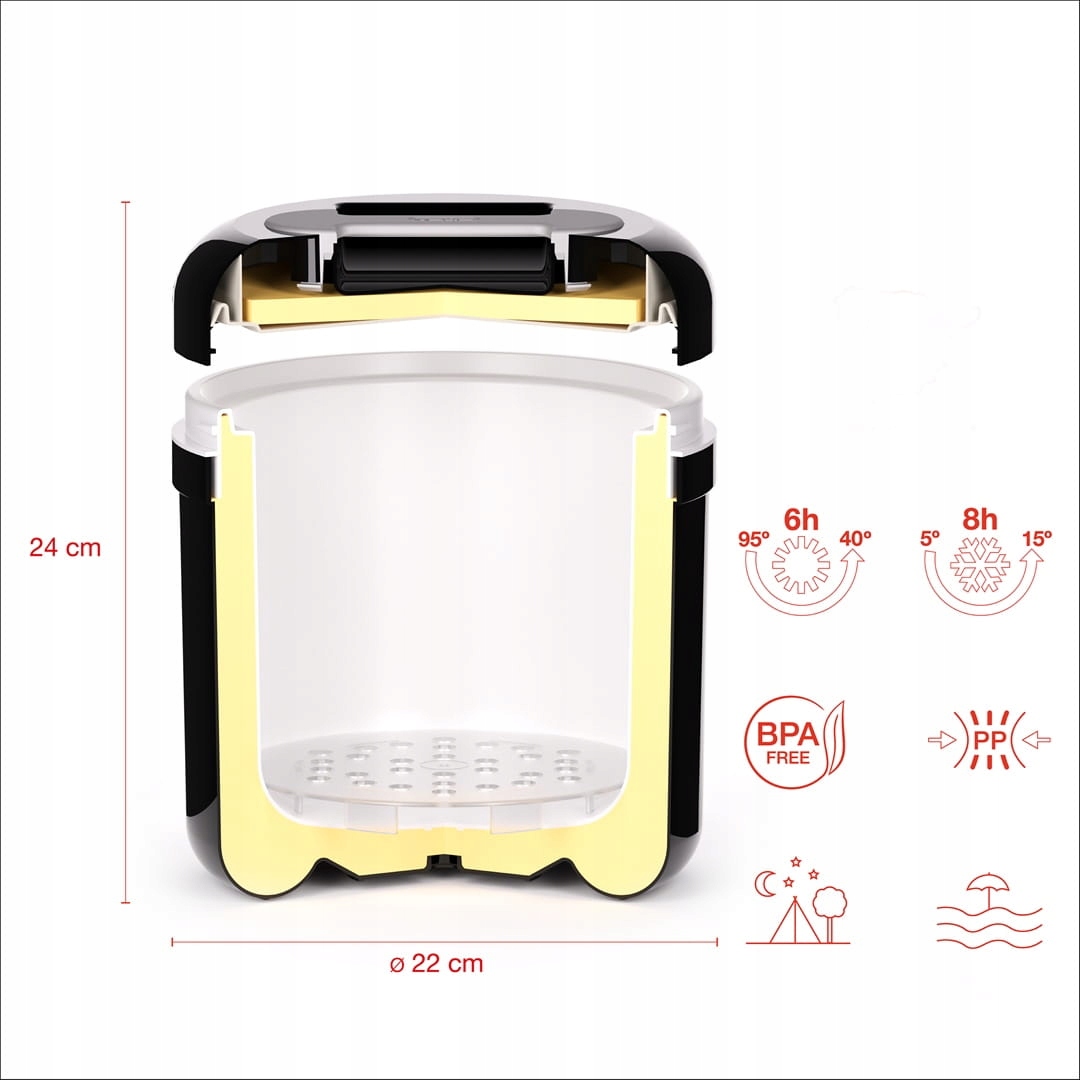 Контейнер может сохранить температуру от 40 до 95 градусов в течение 6 часов, а температура от 5 до 15 градусов в течение 8 часов! Как и совок, это продукт из предложения немецкого производителя аксессуаров с высоким классом.