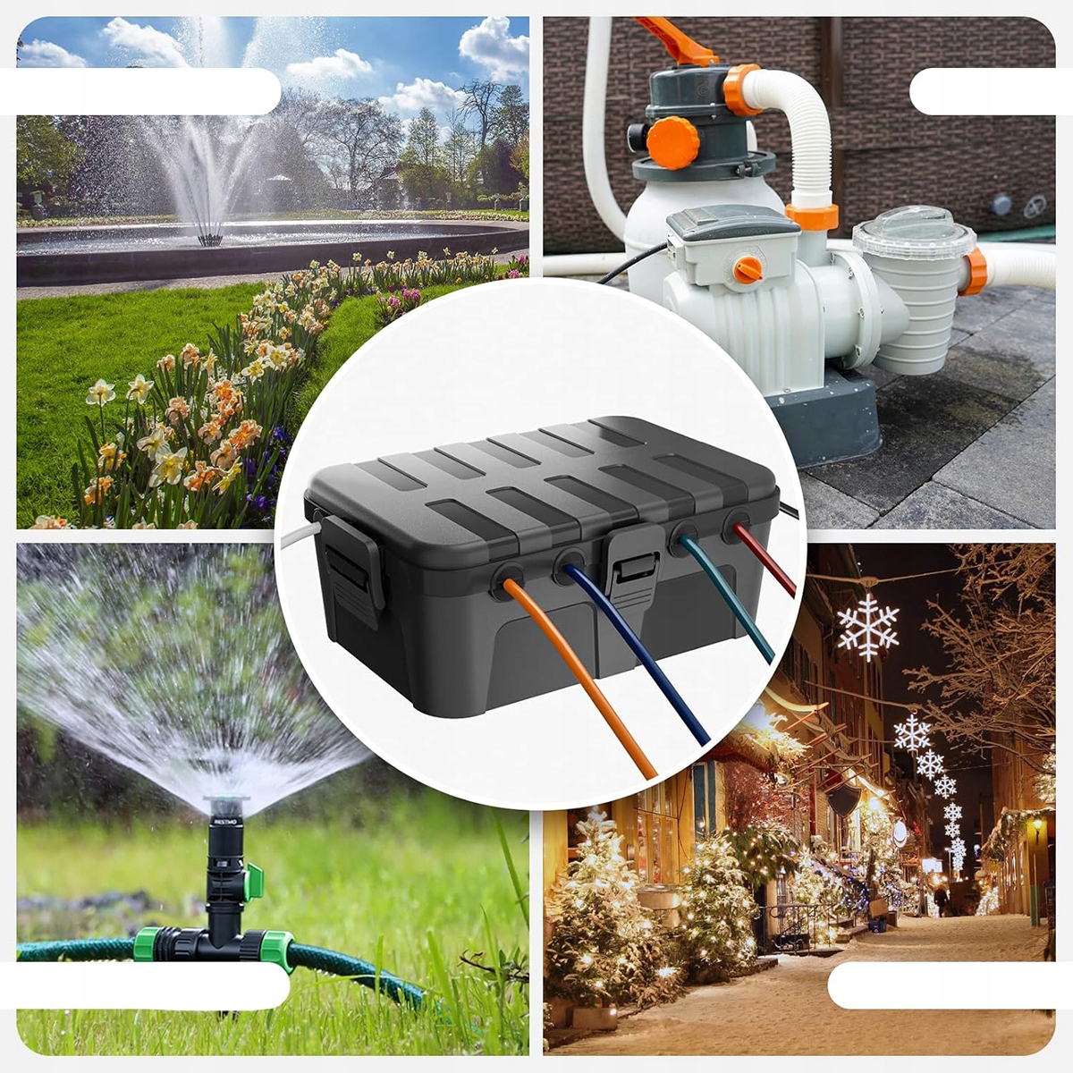 Идеально подходит для широкого спектра наружного и внутреннего применения, включая садовые электроинструменты, рождественские гирлянды, ландшафтные украшения, насосы для бассейнов, фонтаны, пруды с рыбой, обогреватели для террас, кондиционеры, камеры видеонаблюдения. и многое другое.