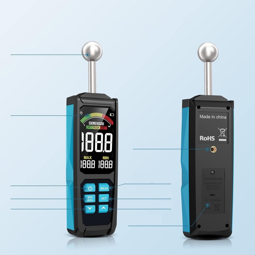 - ✔ оснащен 3-дюймовым экраном HD с тремя красочными аналовыми полосками, показывающими сухую, рискованное и влажное зеленое, желтое и красное, что очень красиво и интуитивно понятно, а также очень легко читать при слабом освещении.