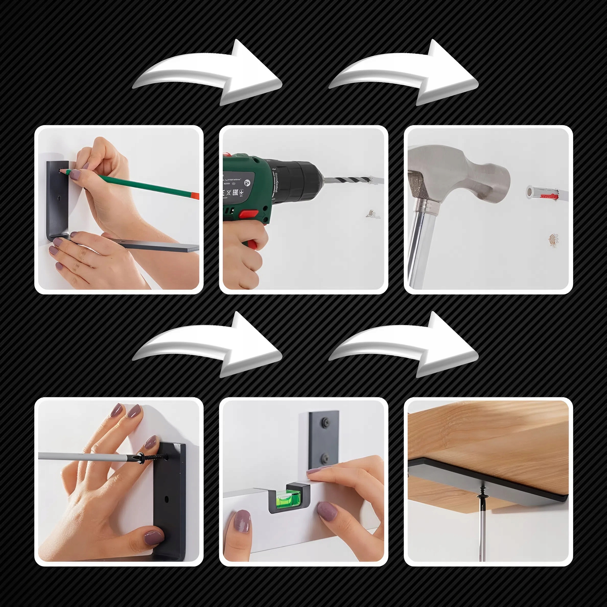 4 отверстия (2 к стене, 2 на полку) обеспечивают твердый монтаж, а полость под головой делает винты невидимыми.