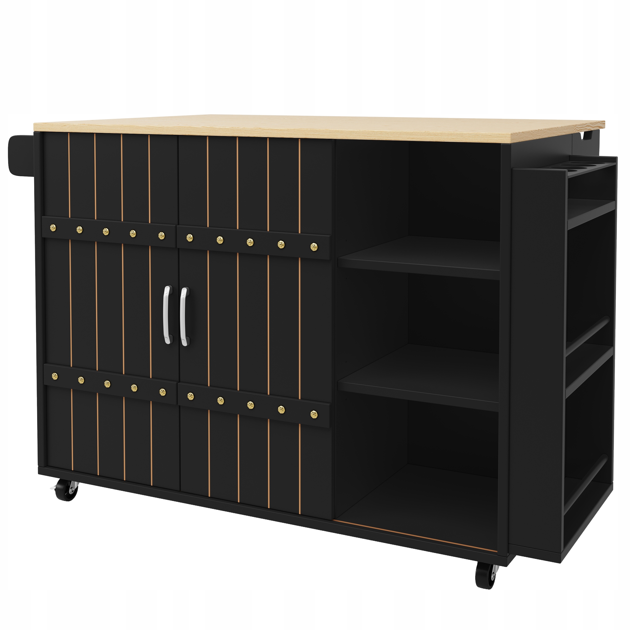 кухонный шкаф, портающая тележка с деревянной зерном, кухонная коляска с колесами и рабочая столешница, кухонная коляска со пряночной полкой и вешалка для полотенец, кухонный остров с раздвижными дверями и ящиками, черный