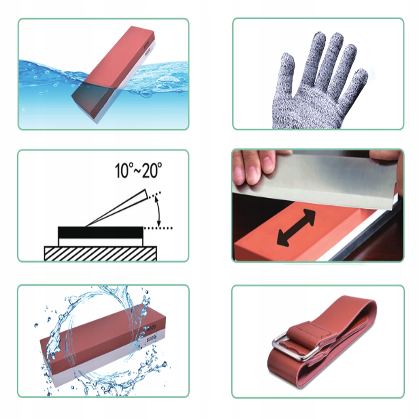 - Включено: два камня из корунда, кожаный ремешок, ремонт камня, направляющий угол, бамбуковая подставка и камень, сглаживающий лист