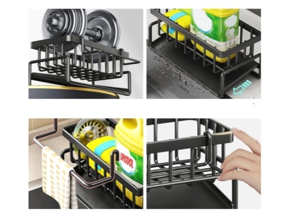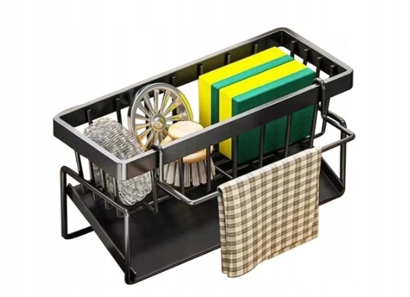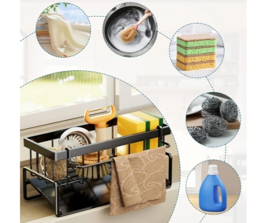 ✅ Уникальный дизайн 3 в 1 - основная корзина для аксессуаров, держатель для полотенец спереди и поддон для капель внизу создают комплексное решение для организации пространства у мойки.
