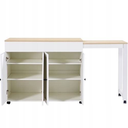 Размеры продукта: эта гастрономическая коляска составляет 140 см, шириной 40 см и 93,5 см в высоту. Он имеет складные боковые панели, которые после развертывания образуют обеденный стол. Общая длина сложенных боковых панелей после развертывания составляет 70 см.