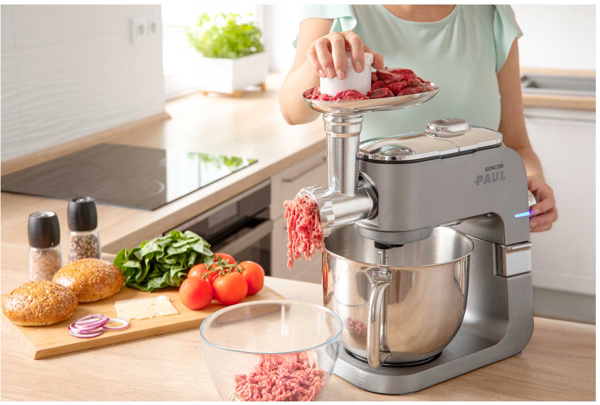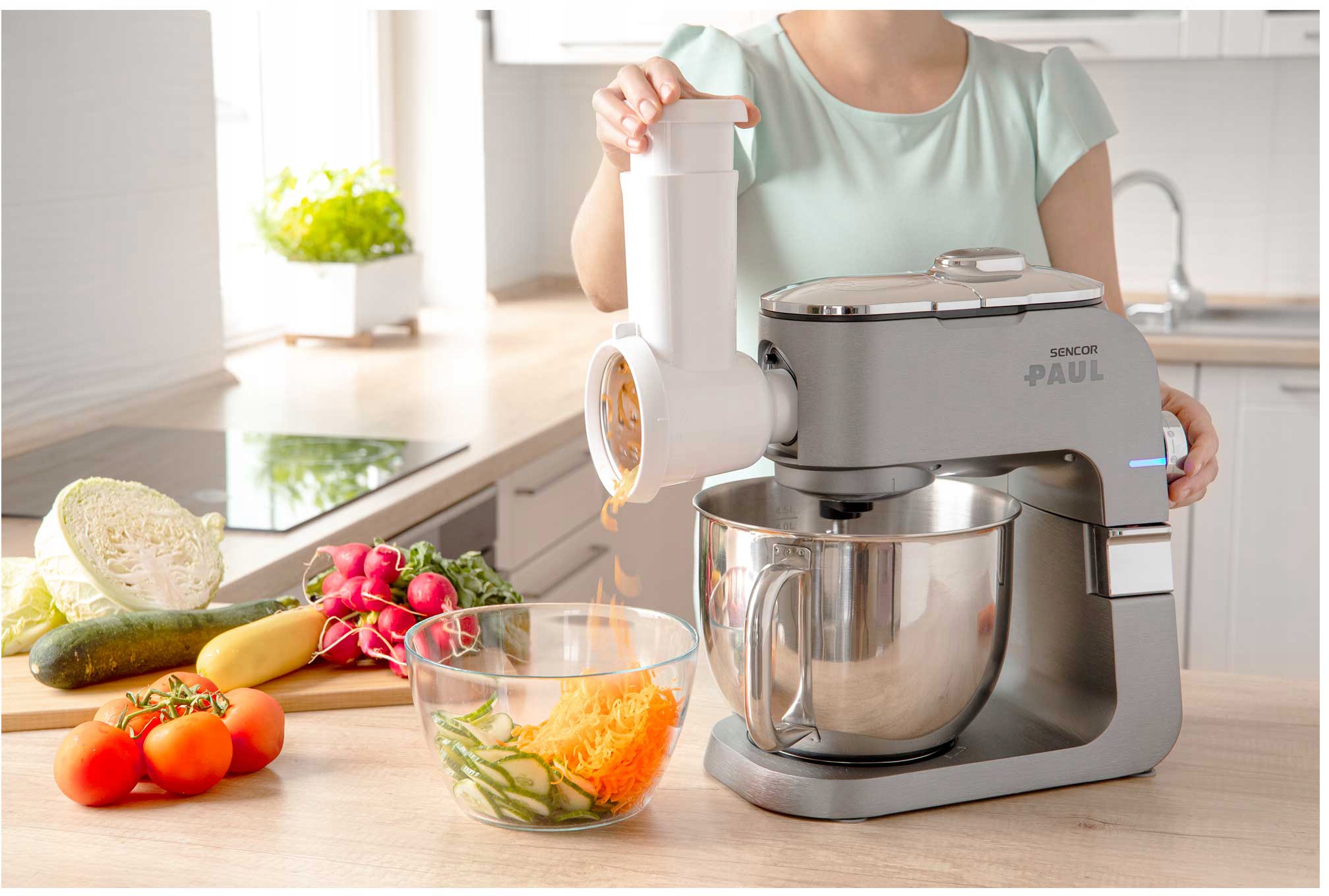 Робот PAUL 1 позволяет готовить широкий ассортимент блюд благодаря дополнительным аксессуарам: насадке для колбасы, насадке для печенья, брызговику и защитному чехлу. Светодиодная подсветка чаши облегчает контроль над процессом смешивания, а функция взбивания позволяет приготовить пену из до 8 яичных белков.