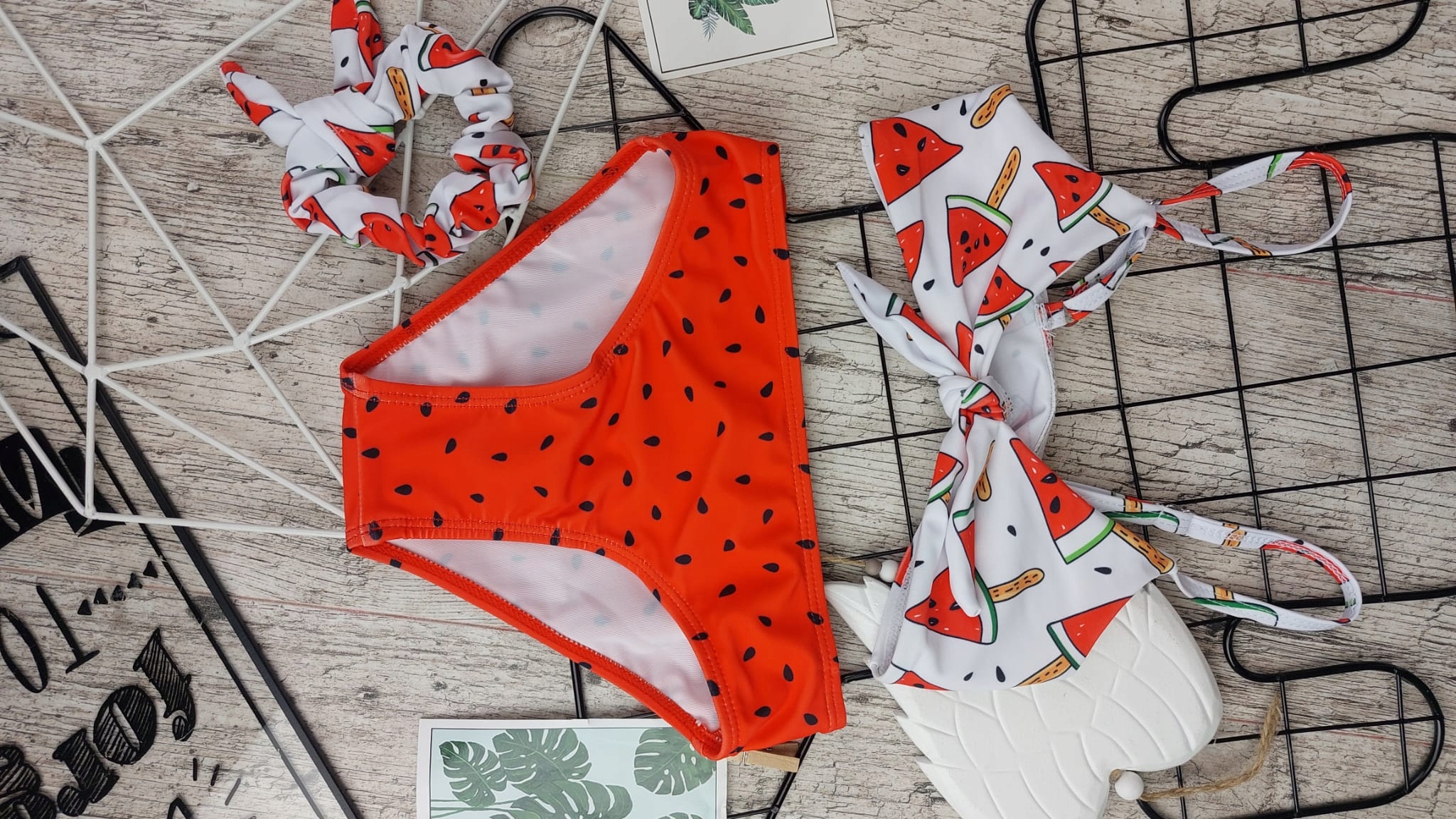 Принт в виде уникального узора, главным героем которого является арбуз :) Нежный бантик на лифе. Бюстгальтеры 11-12 размера имеют съемные вставки. Имеет регулируемые бретели. Ободок для волос также с арбузным мотивом. Все это просто КУЧА :)!