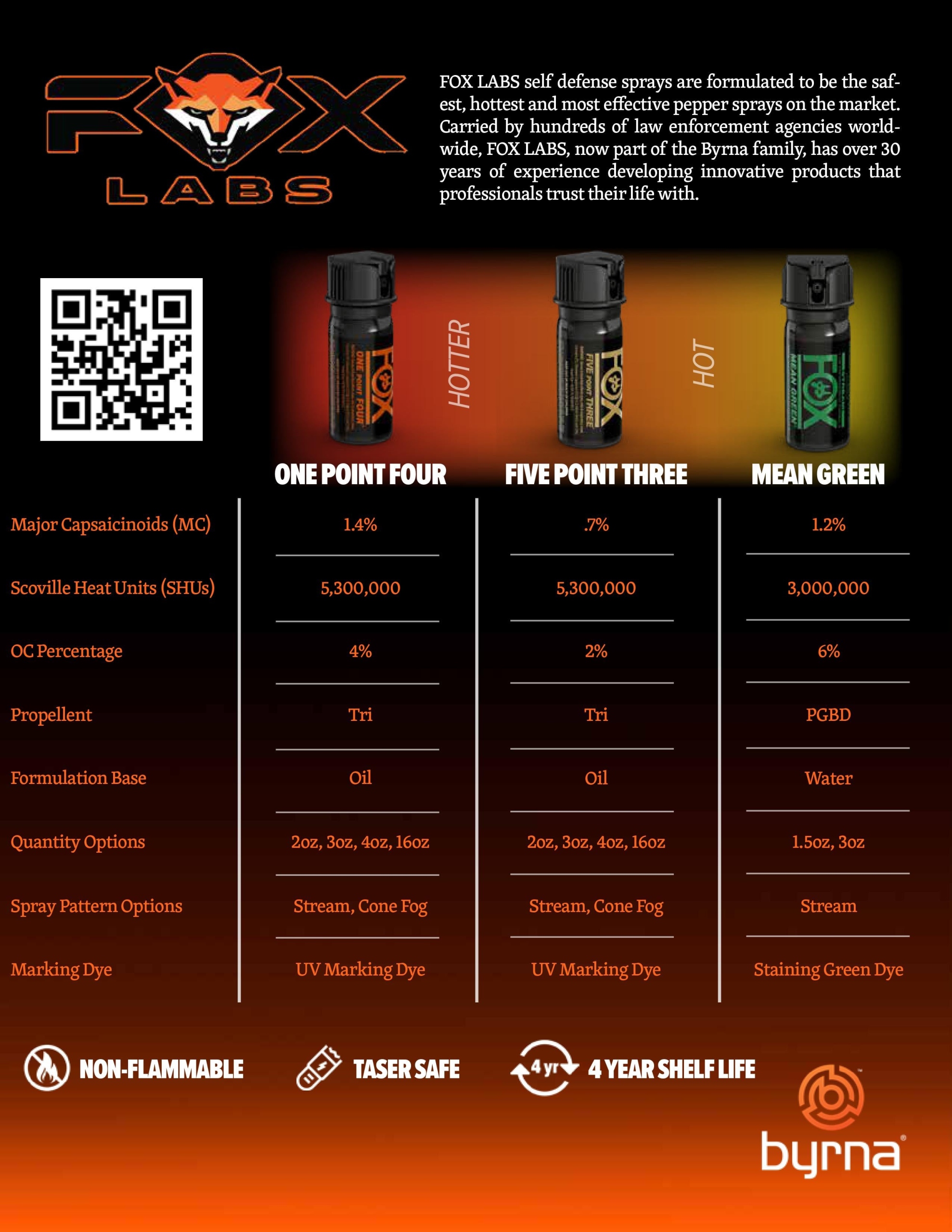 Оборонительный газ от американской компании Fox Labs считается наиболее эффективным газом в мире. Его легендарные пять очков три 5,3 млн. Шу гарантируют быстрое и эффективное превышение возвышения агрессора, а новая формула удвоенной суммы ответственности приводит к еще более сильным и более длительным действиям. Полем Fox Labs Gases также используются государственной и дорожной полицией, полицейскими участками, городской охраной, исправительными домами и тюрьмами, а также агентствами по преступной полиции, военными гендармериями.