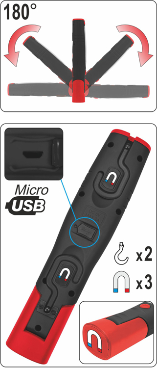 Поворотный корпус позволяет наклонять лампу под любым углом. Благодаря этой функции, а также двум дополнительным крючкам и трем магнитам его можно легко и гибко прикрепить. Это позволяет оптимально осветить нужное пространство, оставив руки свободными.