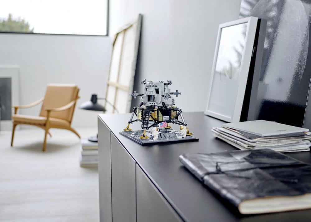 - Усовершенствованный набор LEGO®, включающий подробную копию лунного посадочного модуля Eagle с отдельными стадиями подъема и спуска, стоящего на поверхности Луны. с кратером, следами и американским флагом.