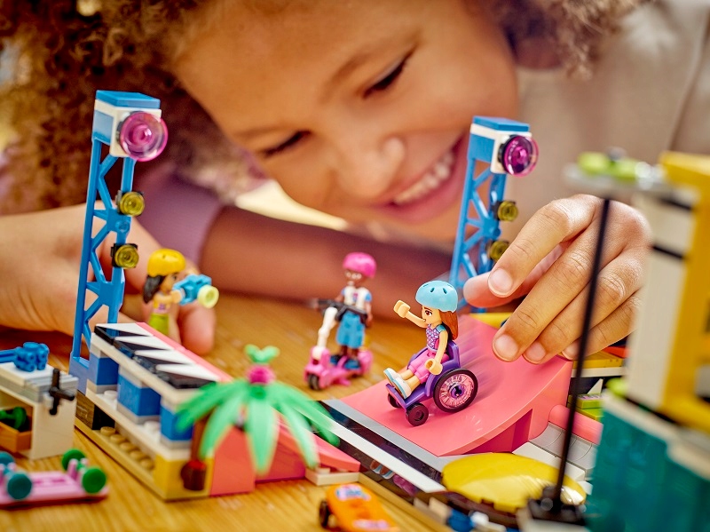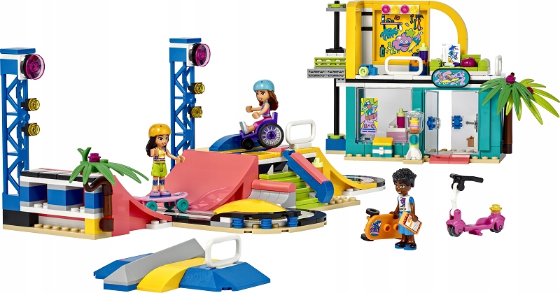 3 фигурки мини-кукол и аксессуары — в комплект входят персонажи LEGO® Friends Лианн, Зак и Луна, пандусы, поручни, роликовые коньки, скейтборд, самокат, инвалидная коляска Луны и шлемы для всех персонажей.