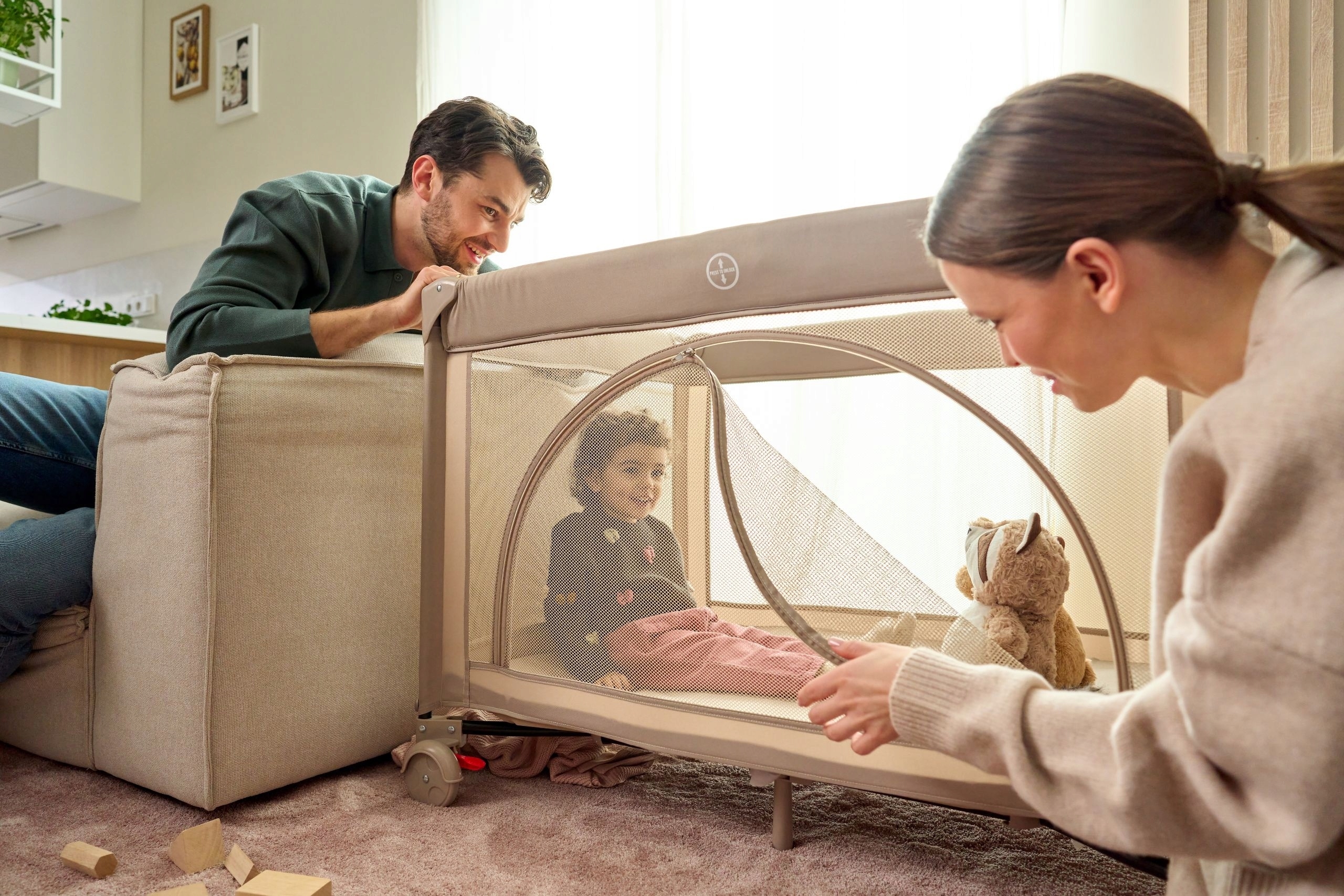 Стороны от сетки позволяют вам поддерживать зрительный контакт между ребенком и родительским и обеспечивать достаточную циркуляцию воздуха.