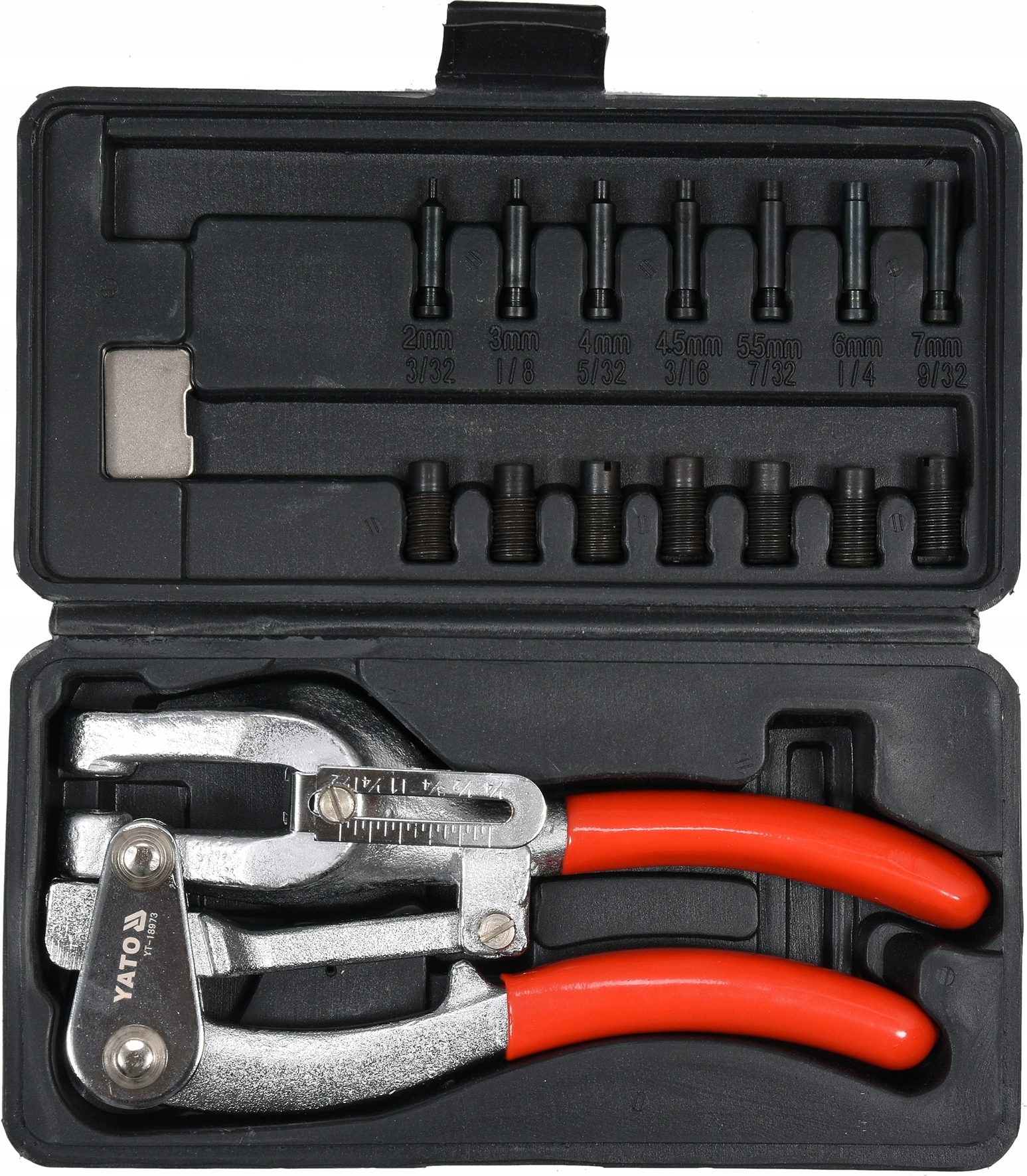 В комплект входят сменные закаленные матрицы и пуансоны диаметром: 2, 3, 4, 4,5, 5,5, 6, 7 мм. б>Регулировка расстояния отверстий от края материала в диапазоне от 6,35 до 38 мм. Набор упакован в кейс из прочного пластика.
