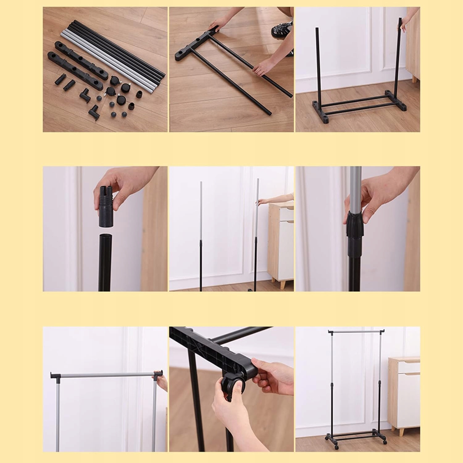Весь комплект одежды можно легко переместить из одной комнаты в другую, не снимая его. Колеса имеют фиксатор, который стабилизирует вешалку во время использования.