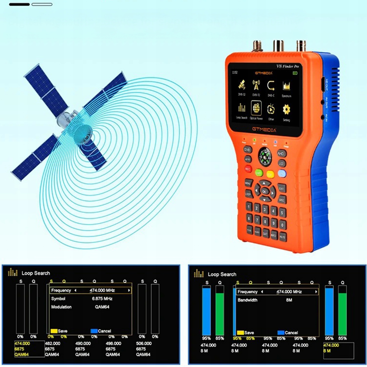 - ✔ Автоматический расчет угла AZ, EL: значительно ускоряет настройку спутниковой антенны, автоматически расчета необходимые углы на основе ширины и географической длины. КГц: Полная совместимость с расширенными конфигурациями антенны.