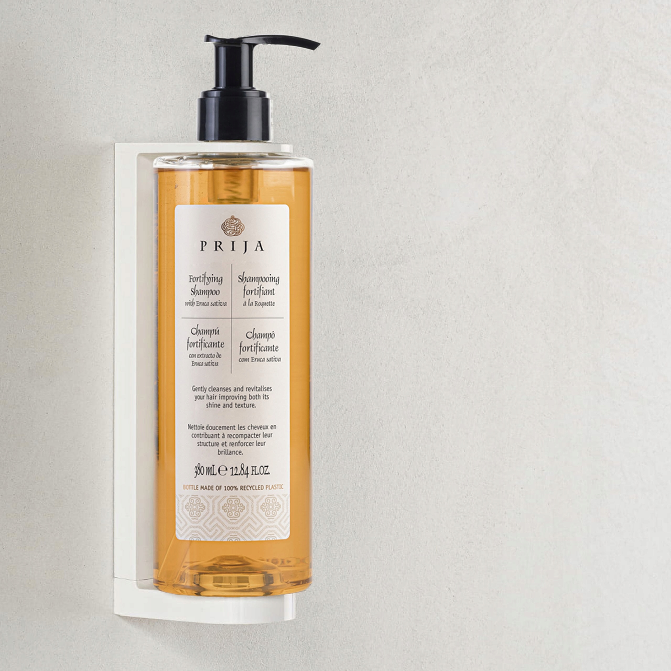 Набор для ванной комнаты PRIJA: белая подставка для бутылки, шампунь для волос с рукколой 380мл + запас 5л