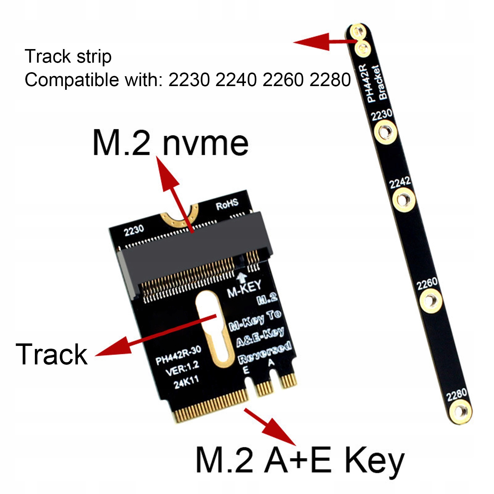 4. Широкая совместимость: адаптерная карта поддерживает 2230 2240 2260 2280 M.2 Размеры карт, обеспечивая совместимость и производительность для интерфейса интерфейса M.2 A и E Wi -IF, инвертированного M NVME SSD.