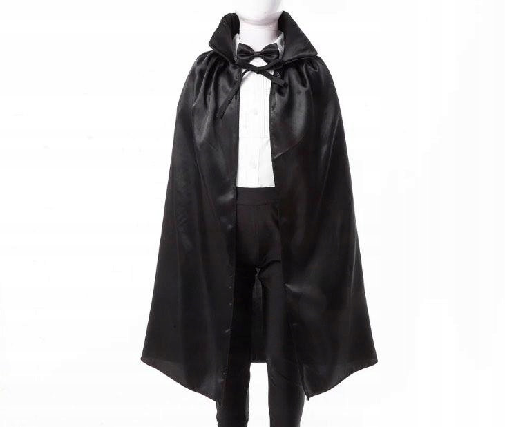 ✅ Накидка чёрная: изготовлена из блестящего, атласного материала, качественного чёрного цвета, завязывается на шее, с воротником-стойкой слегка жёсткой. Длинный, воздушный таинственно струится по спине. Идеально сочетается с остальным нарядом.