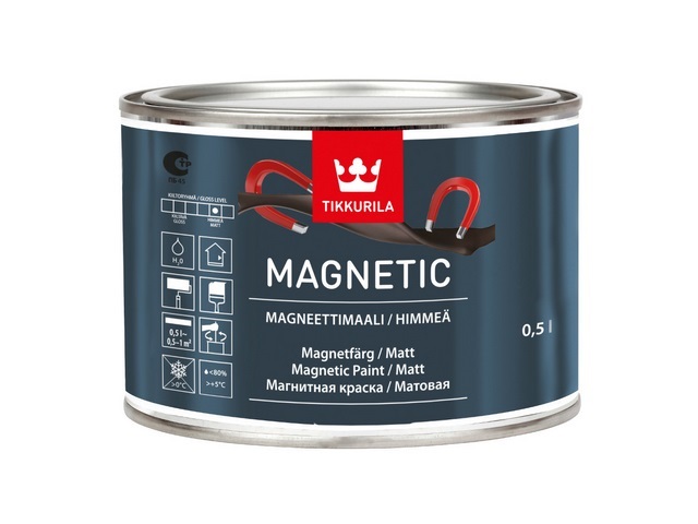 Подходит для покраски бетонных, шпаклевочных, штукатурных и ДСП поверхностей. Для получения любого цвета краску Tikkurila Magnetic можно покрасить красками для стен Tikkurila один или два раза. Нанесение слишком толстых слоев краски может ухудшить прилипание магнитов.