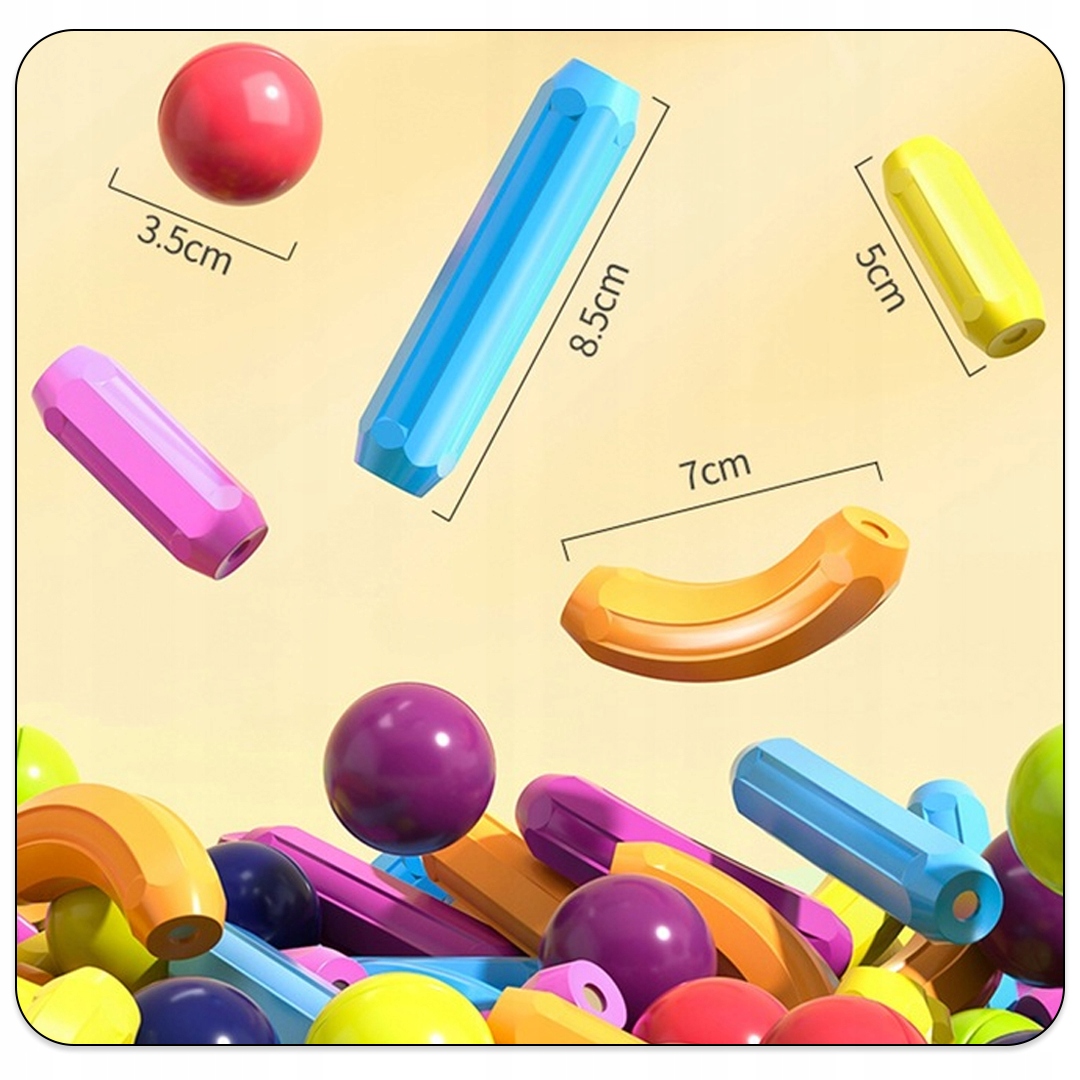 Большие шары диаметром 35 мм изготовлены из металла и покрыты глянцевым лаком. Разноцветные палочки имеют на концах сильные магниты. Все элементы можно комбинировать между собой – палка с палкой или палка с мячом.