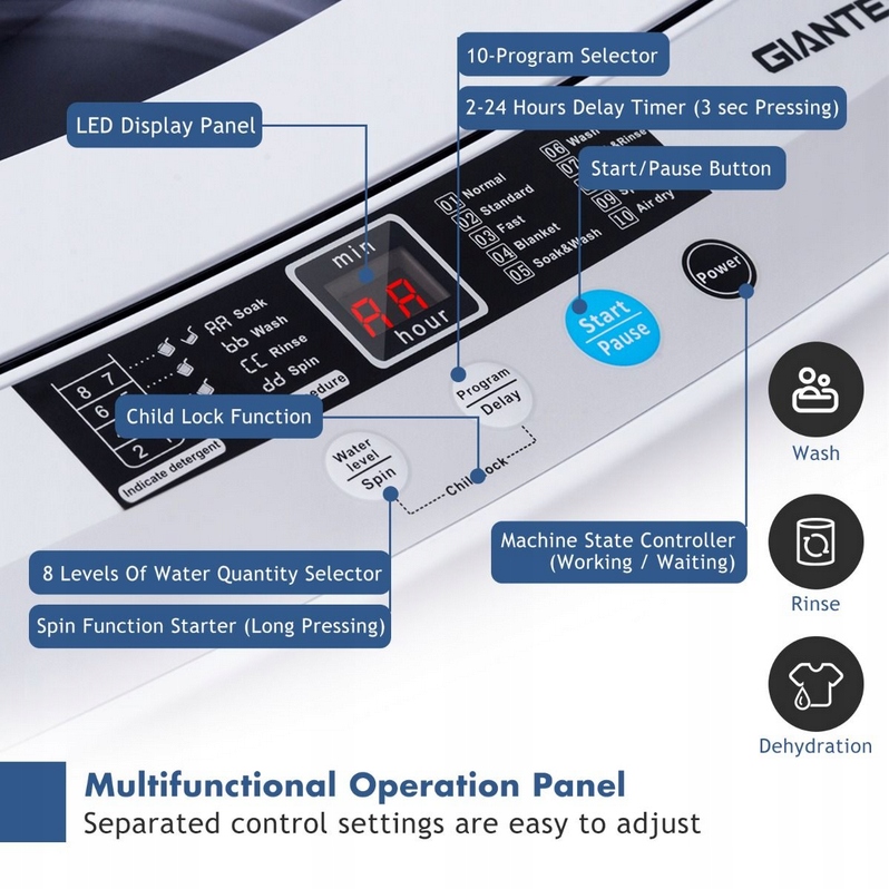 Многофункциональный дизайн: Панель управления предоставляет понятный список всех программ, функций, выборов и операций. Он включает в себя 10 программ в сочетании с замачиванием, стиркой, полосканием, отжимом и 8 уровнями воды, что позволяет адаптироваться к различным режимам в соответствии с вашими ежедневными потребностями.