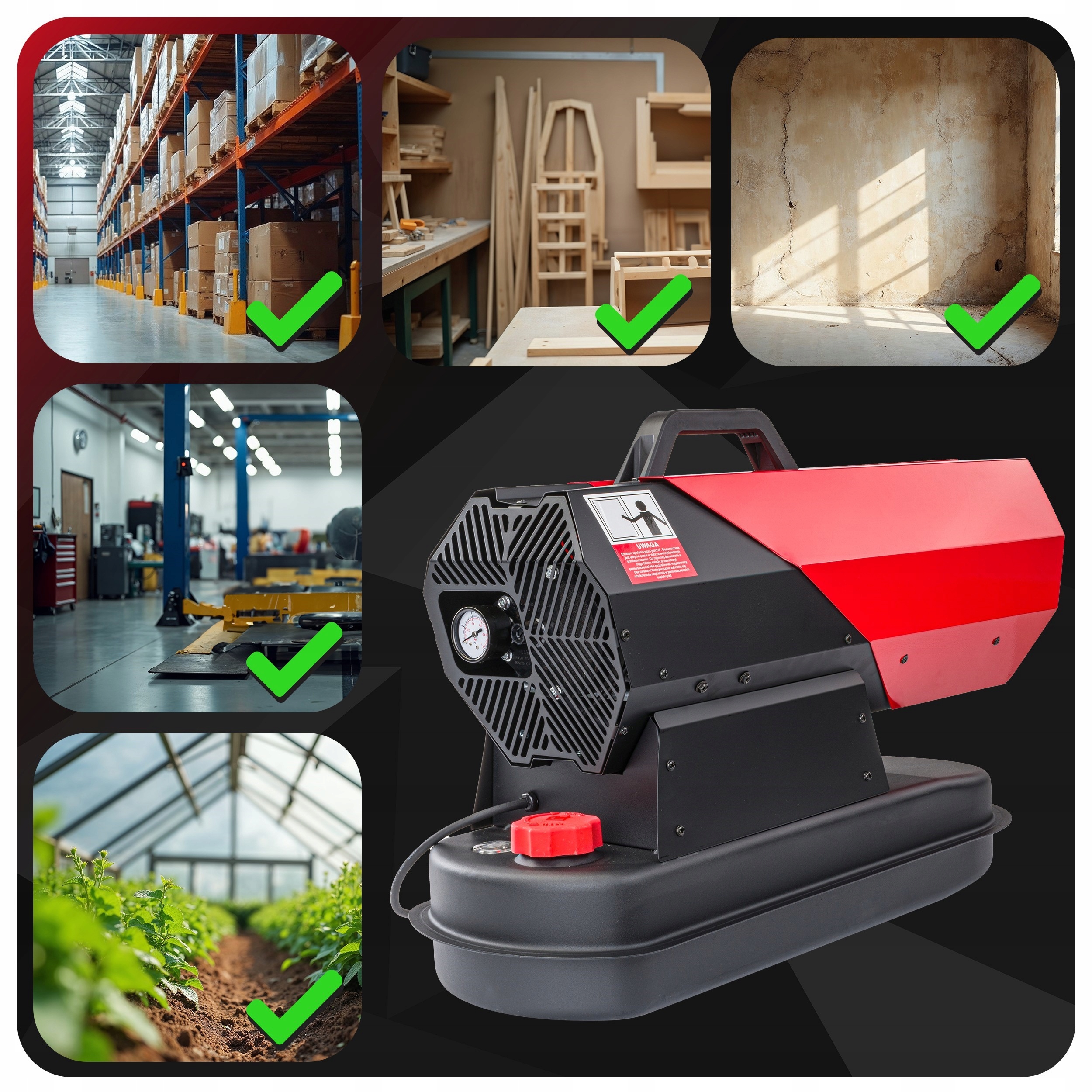 Нагреватель идеально подходит для обогрева объектов, производственных цехов значительной высоты, хозяйственных построек, путей сообщения, складов, мастерских, церквей, теплиц, туннелей и для животноводства где обеспечена надлежащая вентиляция. Благодаря своей мобильности и эффективности он идеально подходит для больших, плохо изолированных помещений, где необходимо быстрое и эффективное повышение температуры.