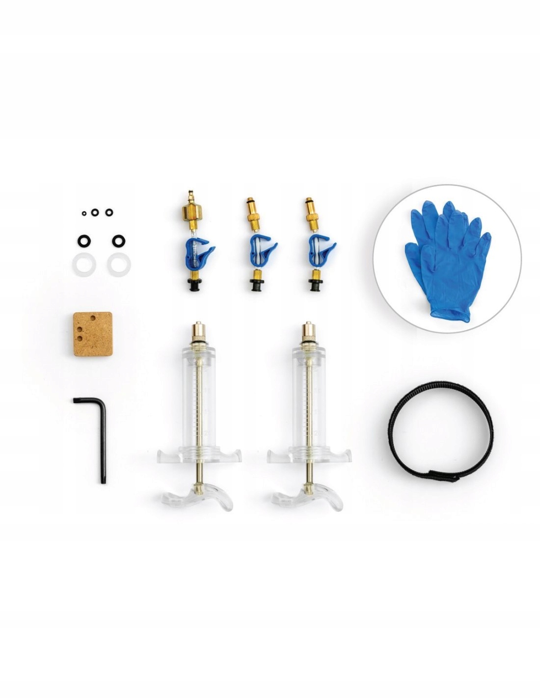 В комплект Bleedkit.com для гидравлических тормозов SRAM входят шприцы TPX, два узла M5, узел Edge , запасные уплотнительные кольца, блок прокачки, ключ Torx, ремешок на липучке и перчатки. Не содержит жидкости.