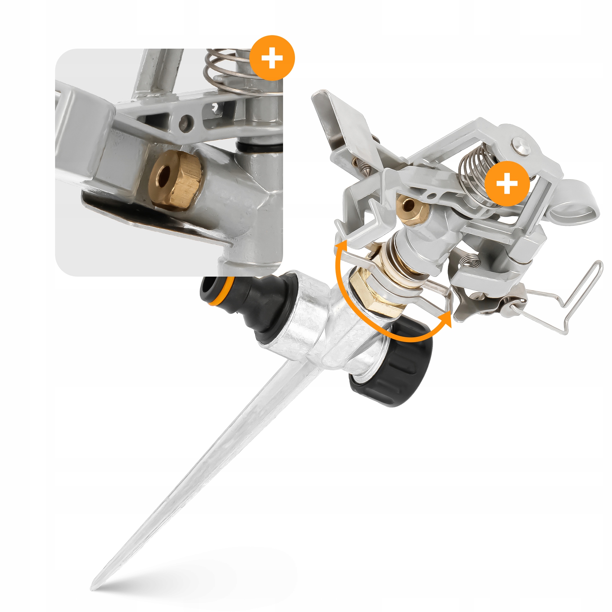 Очень большим преимуществом является сквозная конструкция — благодаря ей можно подключить изделие к другим разбрызгивателям, создав разветвленную систему орошения даже для очень больших садов. Он способен обеспечить орошение площади 570 м2.