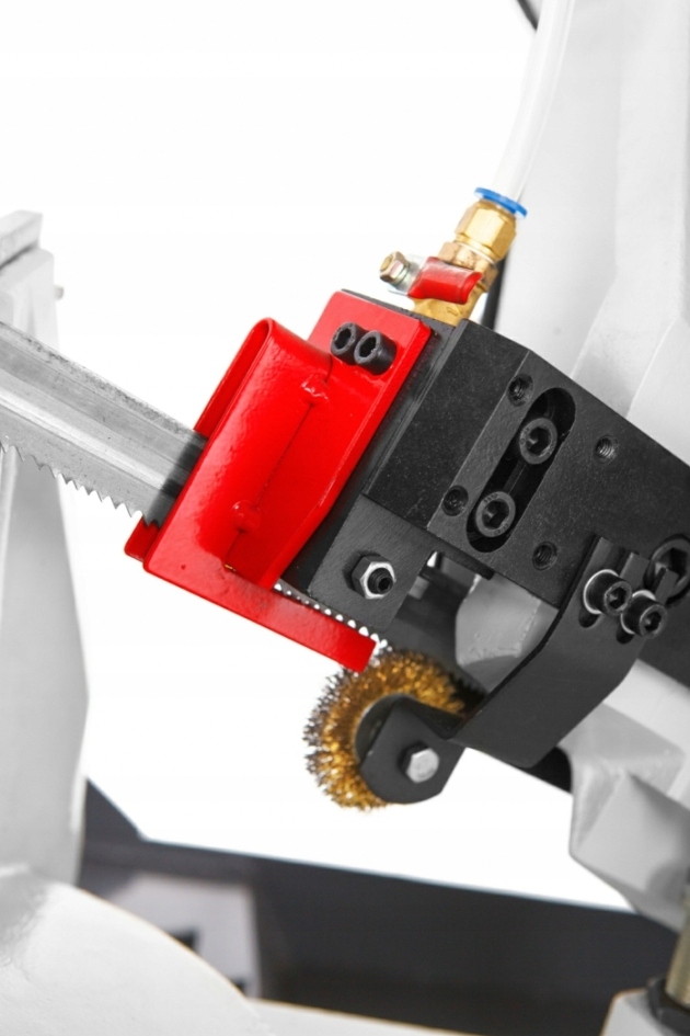 Станок имеет две скорости режущей ленты: 32 и 72 м/мин. Ручка скорости опускания стрелы эргономично расположена рядом с гидроцилиндром. Режущий станок с автоматической, плавно регулируемой, гравитационной подачей рычага вниз. Конструкция: рычаг, тиски и поворотный стол изготовлены из чугуна. Закрытая эмульсионная система охлаждения с распределением жидкости по направляющим пильного полотна. Машина оснащена бампером с линейкой в см для установки длины разрезаемого материала.