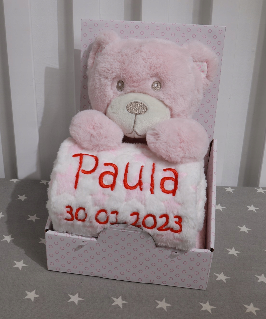- Мы предлагаем сенсационный набор - одеяло из микрофибры с вышитым именем и изображением плюс талисман - Teddy Bear